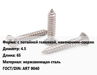 Саморез с потайной головкой, наконечник-сверло D=4.5 L=65 нержавеющая сталь ГОСТ: ART 9040
