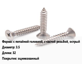 Саморез с потайной головкой, с частой резьбой, острый D=3.5 L=32 оцинкованный, шт цена По запросу где купить, условия доставки в Ижевске и Республике Удмуртия области