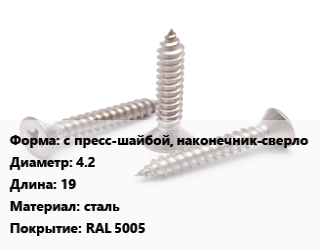 Саморез с пресс-шайбой, наконечник-сверло D=4.2 L=19 сталь RAL 5005, упаковка 1000 шт цена от 678.94 ₽ / кг, где купить, условия доставки в Ижевске и Республике Удмуртия области