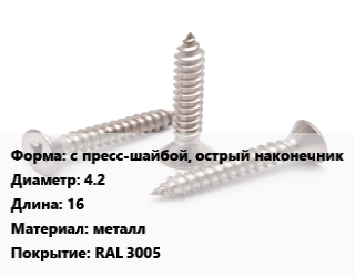Саморез с пресс-шайбой, острый наконечник D=4.2 L=16 металл RAL 3005, кг цена от 125.24 ₽ / кг, где купить, условия доставки в Ижевске и Республике Удмуртия области