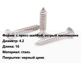Саморез с пресс-шайбой, острый наконечник D=4.2 L=16 сталь черный цинк, упаковка 1000 шт цена от 500.41 ₽ / кг, где купить, условия доставки в Ижевске и Республике Удмуртия области