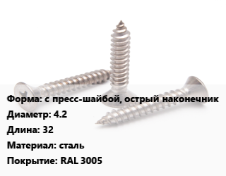 Саморез с пресс-шайбой, острый наконечник D=4.2 L=32 сталь RAL 3005, шт цена По запросу где купить, условия доставки в Ижевске и Республике Удмуртия области