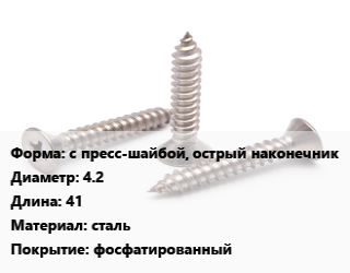 Саморез с пресс-шайбой, острый наконечник D=4.2 L=41 сталь фосфатированный, шт цена от 2.34 ₽ / кг, где купить, условия доставки в Ижевске и Республике Удмуртия области