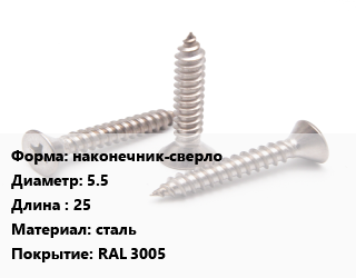 Саморез наконечник-сверло D=5.5 L=25 сталь RAL 3005, упаковка 420 шт цена от 1 233 ₽ / кг, где купить, условия доставки в Ижевске и Республике Удмуртия области