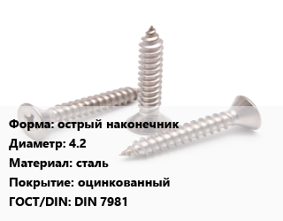 Саморез острый наконечник D=4.2 сталь оцинкованный ГОСТ: DIN 7981