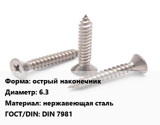 Саморез острый наконечник D=6.3 нержавеющая сталь ГОСТ: DIN 7981