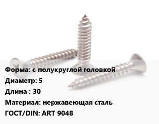 Саморез с полукруглой головкой D=5 L=30 нержавеющая сталь ГОСТ: ART 9048