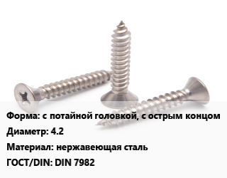 Саморез с потайной головкой, с острым концом D=4.2 нержавеющая сталь ГОСТ: DIN 7982