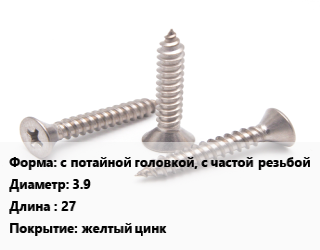 Саморез с потайной головкой, с частой резьбой D=3.9 L=27 желтый цинк, упаковка 6000 шт цена от 3 281 ₽ / кг, где купить, условия доставки в Ижевске и Республике Удмуртия области