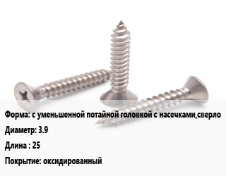 Саморез с уменьшенной потайной головкой с насечками,сверло D=3.9 L=25 оксидированный