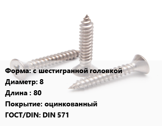 Саморез с шестигранной головкой D=8 L=80 оцинкованный ГОСТ: DIN 571, кг, для дерева цена от 35.09 ₽ / кг, где купить, условия доставки в Ижевске и Республике Удмуртия области