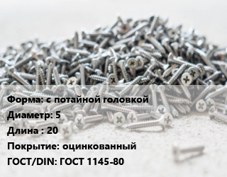 Шуруп с потайной головкой 5х20 оцинкованный ГОСТ: ГОСТ 1145-80