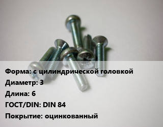 Винт с цилиндрической головкой 3х6 DIN 84 оцинкованный, цена за шт, кг цена По запросу где купить, условия доставки в Ижевске и Республике Удмуртия области