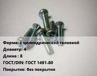 Винт с цилиндрической головкой 4х8 ГОСТ 1491-80 без покрытия