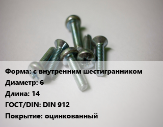 Винт с внутренним шестигранником 6х14 DIN 912 оцинкованный, 10.9,8.8, Китай,цена за шт, кг цена от 222.16 ₽ / кг, где купить, условия доставки в Ижевске и Республике Удмуртия области