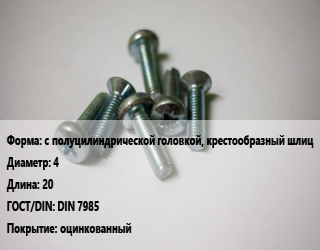 Винт с полуцилиндрической головкой, крестообразный шлиц 4х20 DIN 7985 оцинкованный