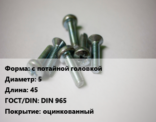 Винт с потайной головкой 5х45 DIN 965 оцинкованный, КНР, цена за 1000 шт,РМЗ, цена за 1000 шт,цена за 1000 шт,цена за шт, кг цена от 778.27 ₽ / кг, где купить, условия доставки в Ижевске и Республике Удмуртия области