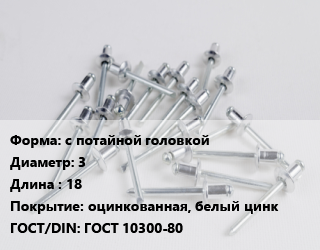 Заклепка с потайной головкой 3х18 оцинкованная, белый цинк ГОСТ: ГОСТ 10300-80