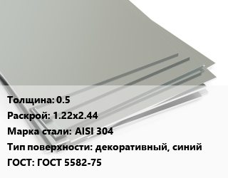 Лист нержавеющий 0.5 1.22х2.44 Сталь: AISI 304 Тип:декоративный, синий ГОСТ 5582-75, по запросу цена от 414 164 ₽ / т, где купить, условия доставки в Ижевске и Республике Удмуртия области