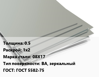 Лист нержавеющий 0.5 1х2 Сталь: 08Х17 Тип:BA, зеркальный ГОСТ 5582-75