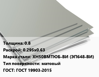 Лист нержавеющий 0.8 0.295х0.63 Сталь: ХН50ВМТЮБ-ВИ (ЭП648-ВИ) Тип:матовый ГОСТ 19903-2015, м2 цена от 1 632 ₽ / т, где купить, условия доставки в Ижевске и Республике Удмуртия области