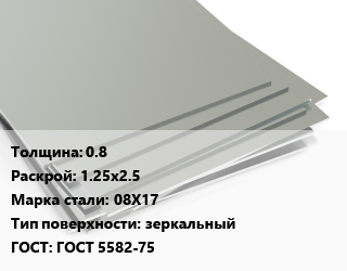 Лист нержавеющий 0.8 1.25х2.5 Сталь: 08Х17 Тип:зеркальный ГОСТ 5582-75