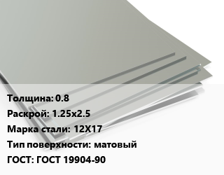 Лист нержавеющий 0.8 1.25х2.5 Сталь: 12Х17 Тип:матовый ГОСТ 19904-90