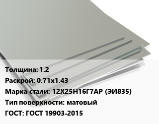 Лист нержавеющий 1.2 0.71х1.43 Сталь: 12Х25Н16Г7АР (ЭИ835) Тип:матовый ГОСТ 19903-2015