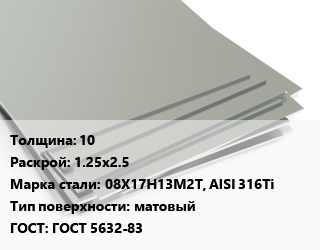Лист нержавеющий 10 1.25х2.5 Сталь: 08Х17Н13М2Т, AISI 316Ti Тип:матовый ГОСТ 5632-83