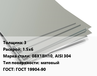 Лист нержавеющий 3 1.5х6 Сталь: 08Х18Н10, AISI 304 Тип:матовый ГОСТ 19904-90
